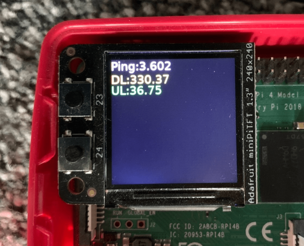 I recently created a script for my Raspberry Pi that checks the latency and speed of my Internet connection every 5 minutes and writes this to a CSV file – which at some point I’ll actually analyse and produce some pretty charts! I wrote about it here. This got me thinking – could I write the output of these tests to my shiny new-ish display? My idea being I can quickly take glance at the display to see the current-ish performance of my Internet connection whenever I have the urge.