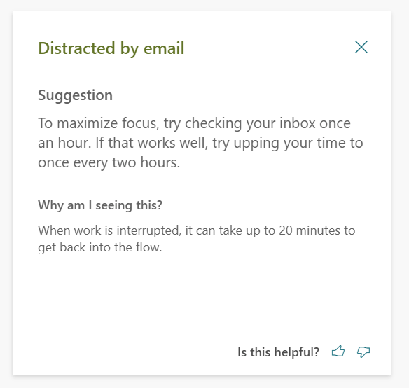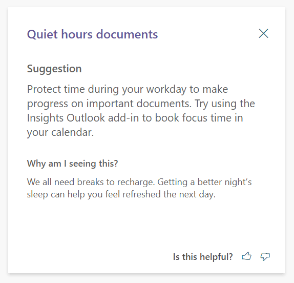 I was particularly excited as MyAnalytics has a wealth of Microsoft 365 usage data, which it analyzes to provide users with personalised insights based on their work patterns and behaviours, for example: