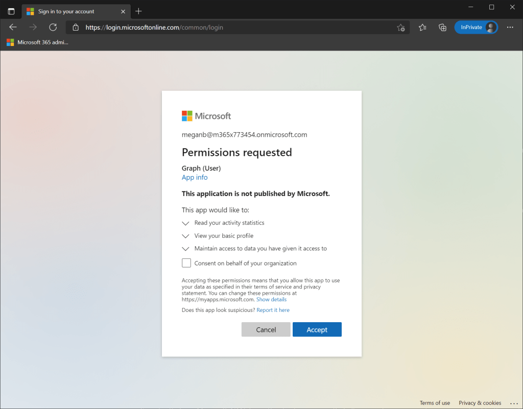 - Prompts the user to authenticate to a M365 tenant (and requests access to the ‘Analytics.Read’ and ‘User.Read’ scopes in the Graph)