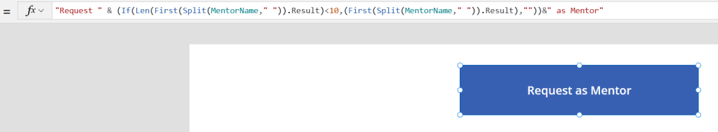 "Request " & (If(Len(First(Split(MentorName," ")).Result)<10,(First(Split(MentorName," ")).Result),""))&" as Mentor"