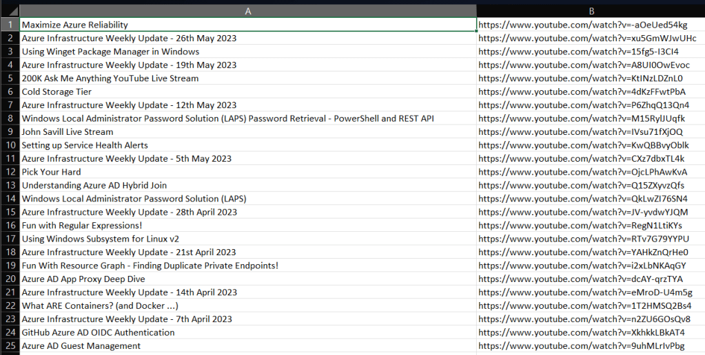I recently had the brainwave of writing a script, that can connect to a YouTube channel and write out a list of all videos and their URLs to a CSV file to help me out here…luckily for me YouTube has a rich API that I could use to do this.