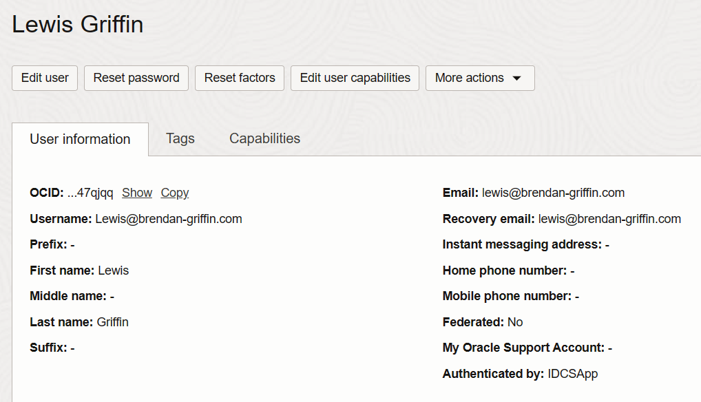 Once I’d done this I was able to successfully login into the OCI console using harrison@brendan-griffin.com, JIT had kicked in, worked it’s magic and created his user account in OCI as part of the login process, configuring this as a federated account.