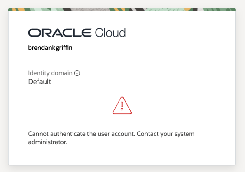 After following the steps to setup JIT (detailed in the link above), I received the following error when attempting to login to the OCI Console using a new account – an account that exists in Azure AD, but not in OCI IAM: