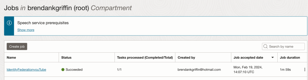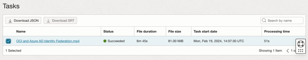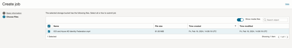 This created a transcripton job named IdentityFederationYouTube, configured it to use the Object Storage bucket named videos and to store the transcription output in the same bucket – on the next screen we’ll select the video to transcribe from the bucket.