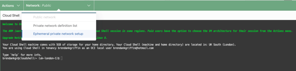 Wait a minute or two! When the network status updates to Ephemeral the Cloud Shell is connected directly to the VCN and subnet selected.