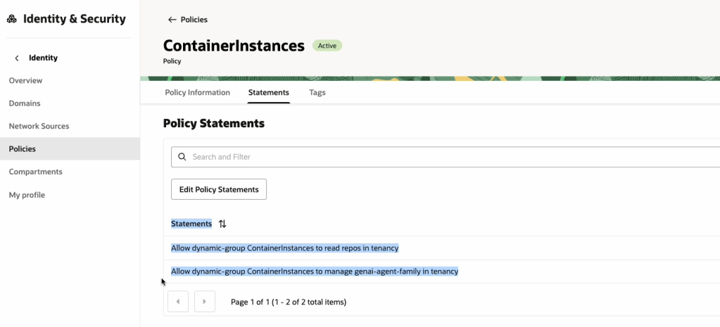 Now that the Dynamic Group has been created, we need to create a Policy that provides this group (e.g. all container instances within the tenancy) access to pull images from the OCI Container Registry and also grant it access to the OCI Generative AI Agents service, the reason for the latter is that we will use Resource Principal authentication to authenticate the container instance to the service, rather than the API Keys for a specific user account (which is safer as we won’t need to include any keys within the container image! π).