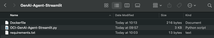 …and Dockerfile (no file extension required!), which is used to create the container image. This will launch the Streamlit app listening on port 80. Ensure that you update the name of the Python script (in this case OCI-GenAI-Agent-Streamlit.py) to reflect the name of the script you need to run.