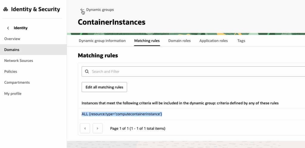 This rule will ensure that every Container Instance within the tenancy is added to the Dynamic Group, which in this example is named “ContainerInstances” – how original! In the real-world, you may want to be more specific and specify a single container instance or Compartment as a member of the Dynamic Group.