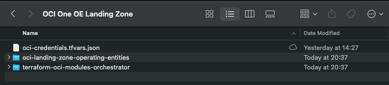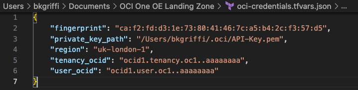 Take a copy of this file, place it in the root of the OCI One OE Landing Zone folder that you just created and rename the file to oci-credentials.tfvars.json