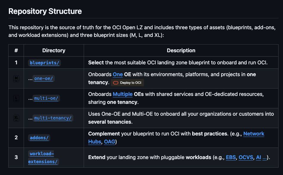 The One OE (Operating Entity) OCI LZ blueprint can be deployed to an OCI tenancy directly from GitHub using the “Deploy to OCI” button: