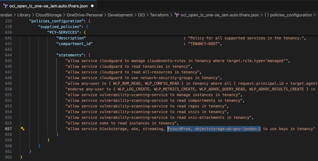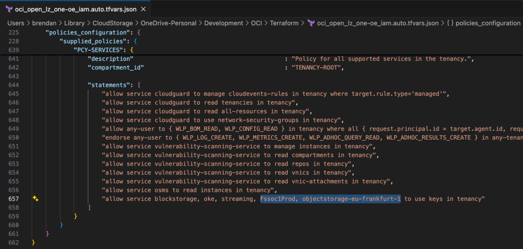 Issue 1 β – oci_open_lz_one-oe_iam.auto.tfvars.json has references to the services highlighted in the screenshot below: