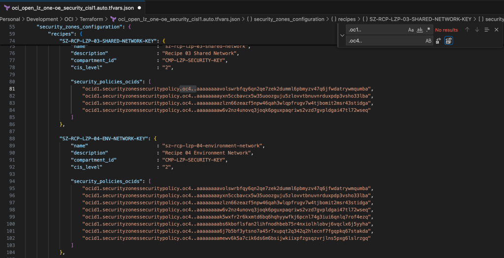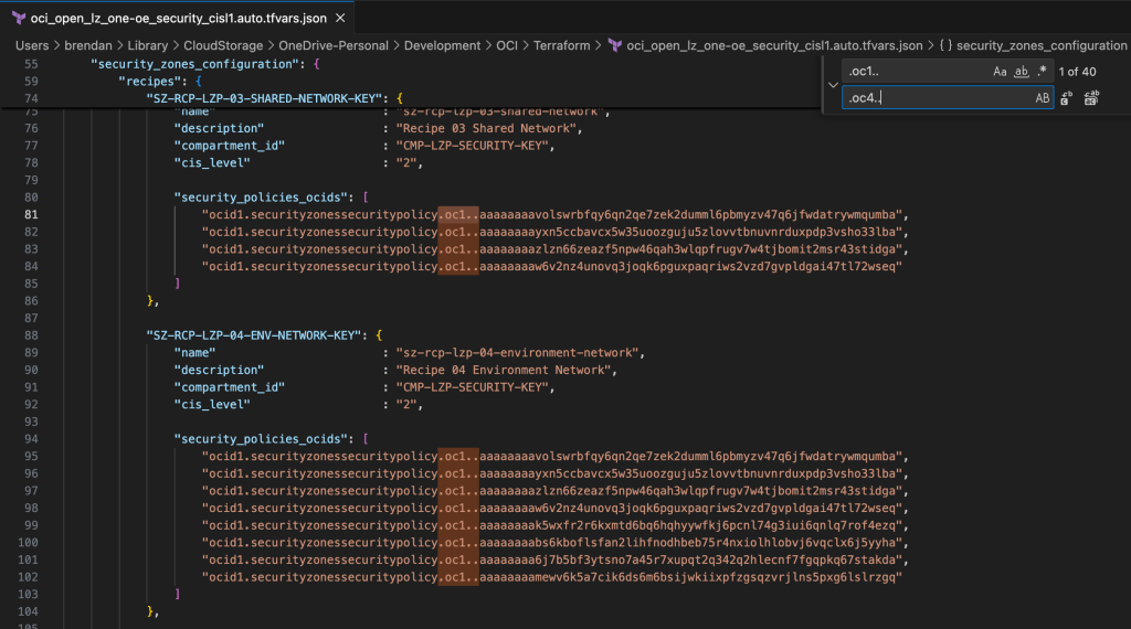 Issue 2 β – oci_open_lz_one-oe_security_cisl1.auto.tfvars.json has 40 references to Security Policies using their actual OCIDs from OC1 – Commercial (see examples below):