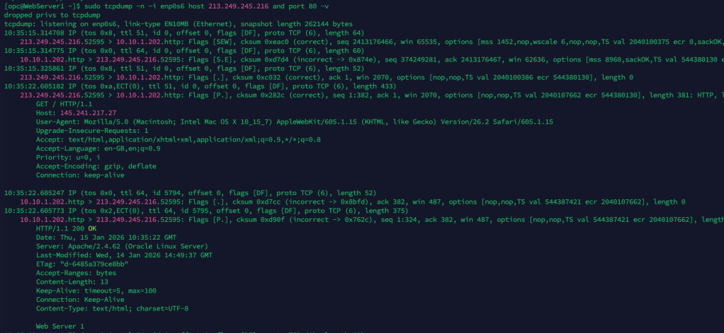 sudo tcpdump -n -i enp0s6 host 213.249.245.216 and port 80 -v