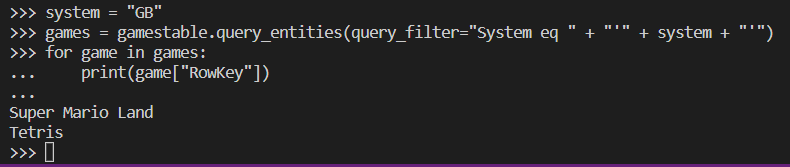games = gamestable.query_entities(query_filter="System eq " + "'" + system + "'")