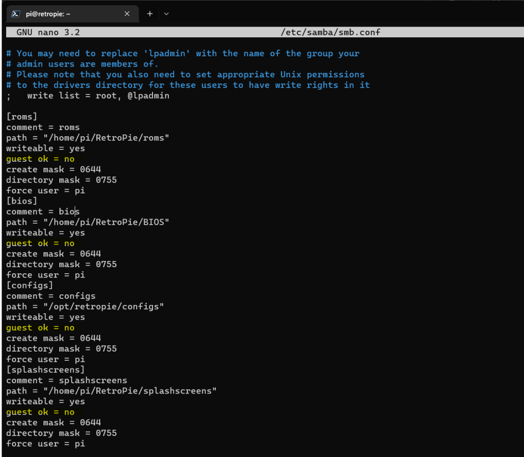 Took a backup of the Samba configuration (incase it all went horribly wrong!) – sudo cp /etc/samba/smb.conf /etc/samba/smb.conf-retropie