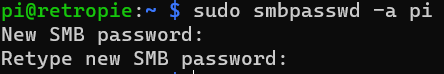 My company block devices connecting to shares that don’t require authentication (which is good!). Therefore, to allow me to connect to the shares created by RetroPie using my Windows PC, I needed to re-configure Samba on the RetroPie to require authentication. I did this using the following steps: