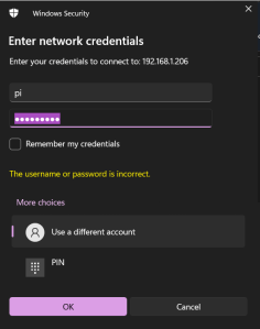 I then entered the credentials for the pi account (using the password I assigned in step 5 above) and hit OK.