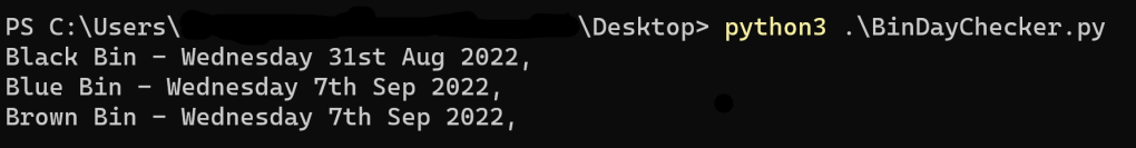 A few months ago, I wrote a Python script that scraped my local council’s website for the bin๐๏ธ (garbage for any Americans reading this) collection schedule, I never seem to know when my bins will be collected and I’m too lazy to check this manually so thought I’d write a script to automate it. The original post can be found here and the Python script here.