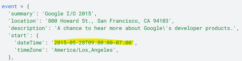 I needed a way to convert the these into the format expected by the Google Calendar API…the Python datetime library and the strptime method to the rescue!