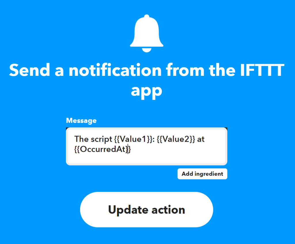 For reference, below are the settings of the notification action. This notification will send a notification with the text below, replacing Value1 with the name of the script and Value2 with the status of the script. OccurredAt will be replaced with the time that the web hook was called.