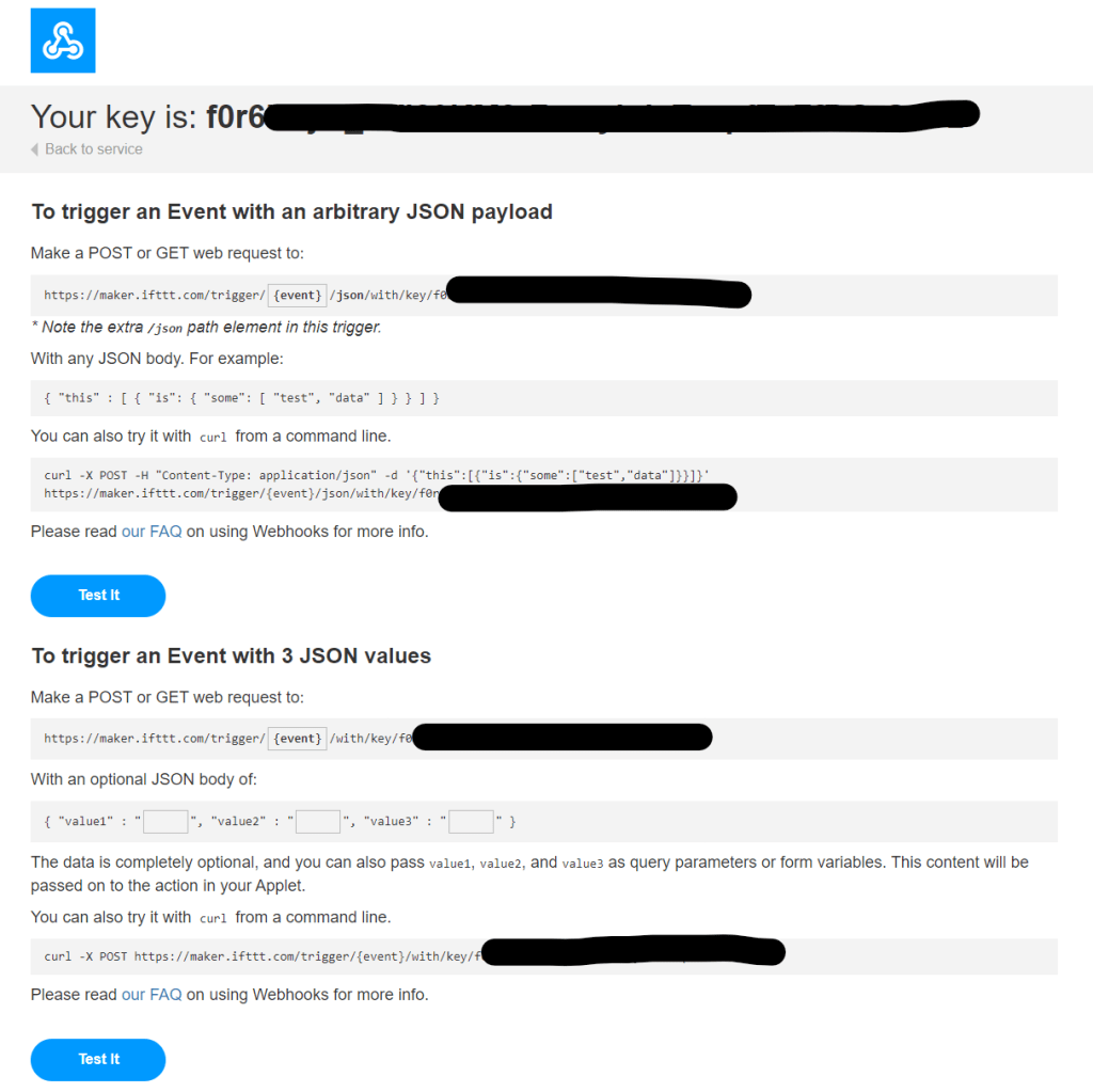 I was now ready to test this, but first I needed to obtain the URL and key for the webhook, I did this by browsing to https://ifttt.com/maker_webhooks and selecting Documentation. This presented my key and also some useful examples.