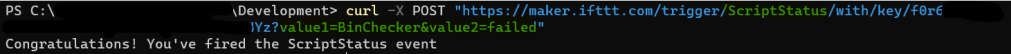 curl -X POST "https://maker.ifttt.com/trigger/ScriptStatus/with/key/KEY?value1=BinChecker&value2=failed"