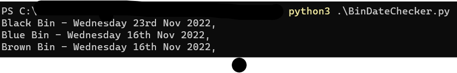 bluebindate = "Wednesday 16th Nov 2022" # Manually specifying the date string for testing using the format returned by the BinDateChecker.py Python script