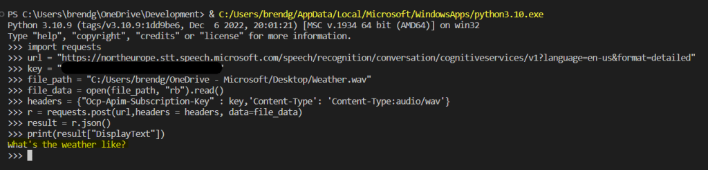I converted the REST sample to use Requests, this takes an audio file (in WAV format), sends this to the Speech Service for analysis and then returns the text identified from the audio file.