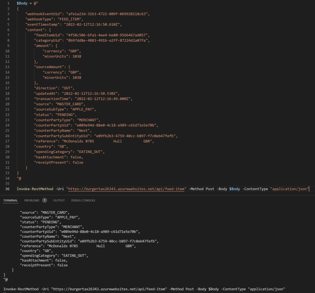 I then fired up PowerShell to send a test request to the Azure Function App using Invoke-RestMethod (this example is a Starling Bank webhook, read more about how I’m using this here).