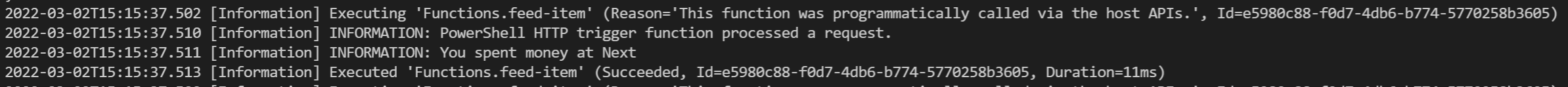 After running this, I flipped back to the other terminal window, where I could see the output – in this case it used Write-Host to confirm that the function had triggered and outputs the name of the merchant (Next in this case).
