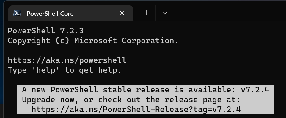 Windows Terminal (which I ๐), recently notified me that I needed to update PowerShell Core. I could have clicked the link and downloaded and installed the updated MSI, however I’m lazy and wanted a quicker way to do this ๐โโ๏ธ.