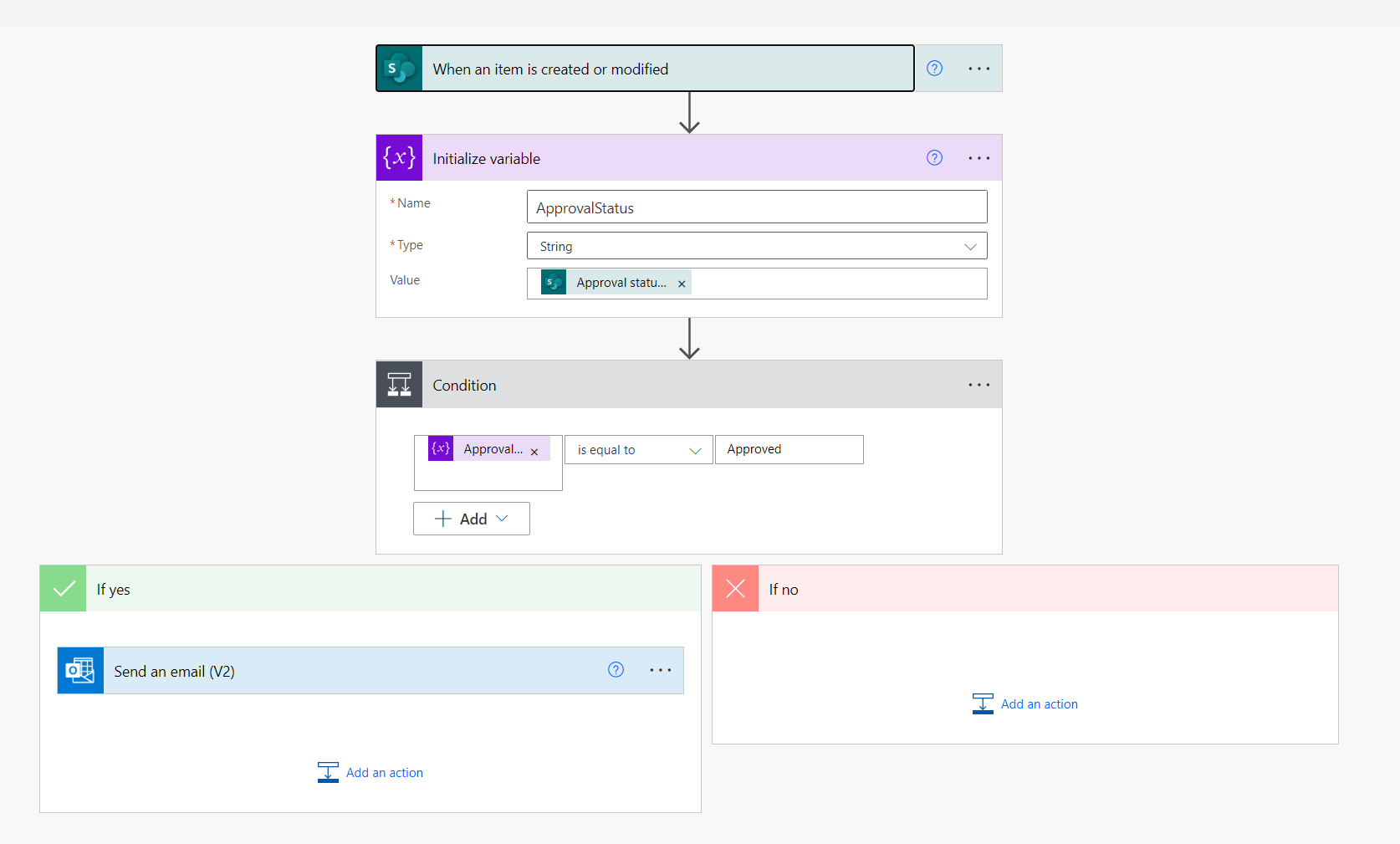 Due to the way that choice fields are returned to Power Automate, I couldn’t use a simple condition that checks the value of the Approval status column and then sends an e-mail if this is equal to Approved.