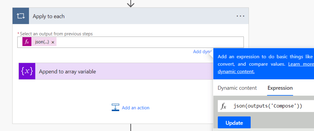 This uses the following JSON function to retrieve the output from the Compose step above – the answer(s) to the question.