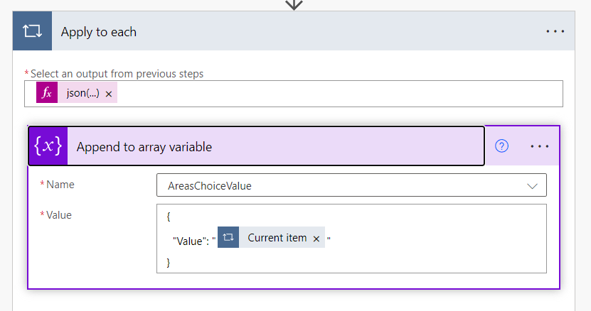 Finally within this block we add Append to array variable using the following format/syntax and referencing the AreasChoiceValue variable created in Step 1: