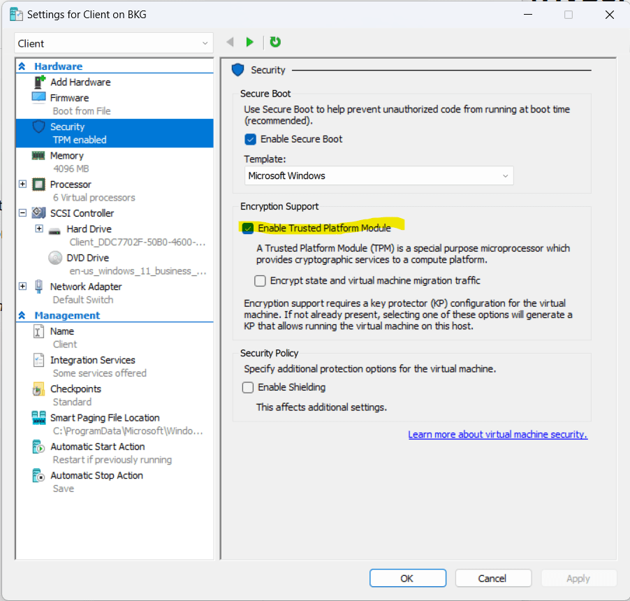 To fix this I needed to enable TPM support within the settings for the VM, it’s also worth noting that the VM should be created as a Generation 2 VM.
