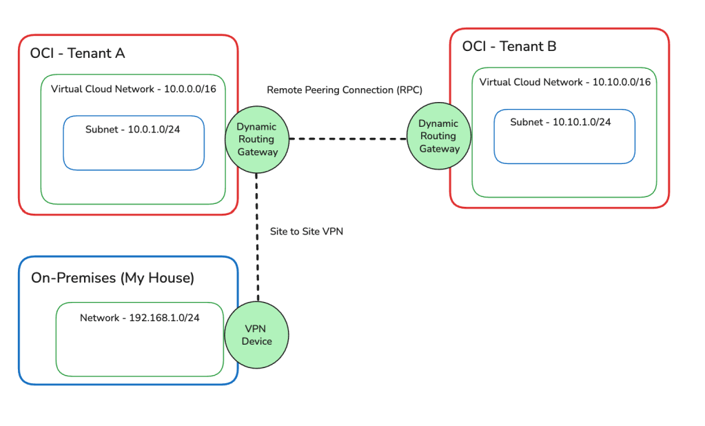 I have an OCI Tenant (Tenant A), which has a Site-to-Site VPN connection configured between my On-Premises network (my house 🏠) and Tenant A, this enables me to connect to resources within my tenant using their private IP addresses rather than using a Bastion/Jump Server – for example I can SSH directly into VM instances.