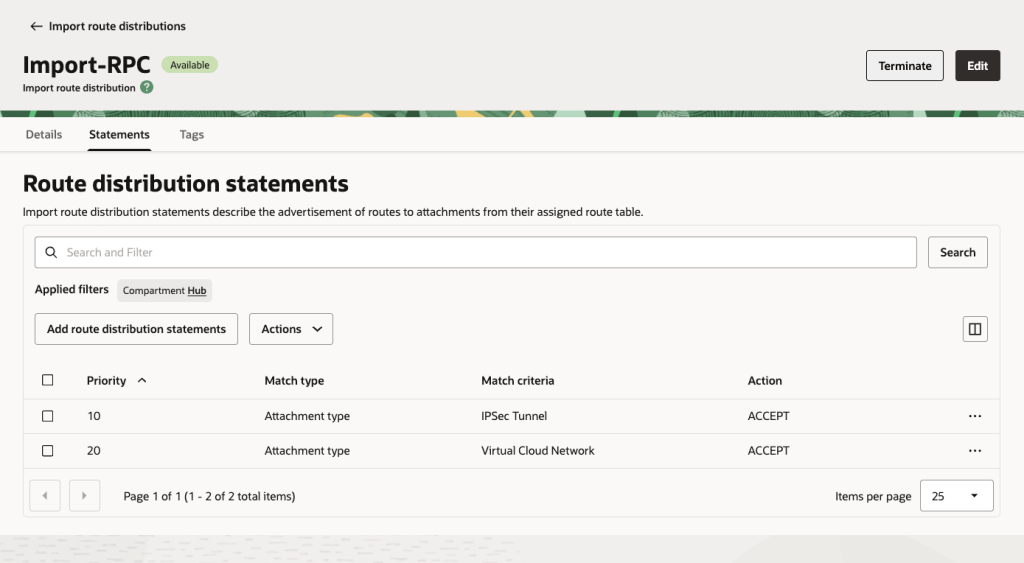 Here are the Route Tables with the mapping to the Import Rule Distributions On-Prem/RPC/VCN: