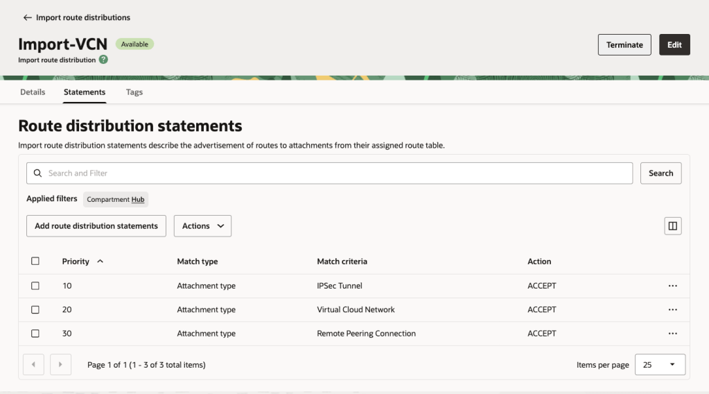 VCN Import Routes: This enables all VCNs to see all of the VCNs, RPCs and IPSec Tunnel.